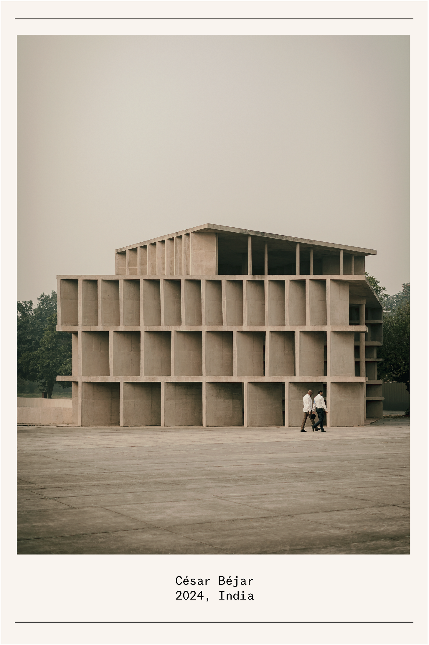 Guadalajara-based César Béjar’s photos capturing Le Corbusier’s buildings in Chandigarh, India, reveal a sense of beauty in their abandonment. While the famed modernist works of Le Corbusier in Europe are so well-maintained that they feel more like museums than the homes or churches they were intended to be, in Chandigarh (where a Le Corbusier planned city remains in various levels of order), César found a new perspective. “In India, you understand his buildings differently because of how they have been ruined; you read the architecture differently and find beautiful chairs designed by Pierre Jeanneret - who worked with Le Corbusier on this project - on the street. Being there is beautiful,” he tells Design Considered. “The scale of the place where the Tower of Shadows (pictured) is located is truly remarkable. It’s situated in the middle of a vast square that seems endless. This vastness creates a unique experience; you keep walking and walking, feeling as if the tower is just within reach, but it remains far away.” Béjar, who is as talented at architecture as he is at photography, shots of the building (originally designed to capture solar movement) effectively convey its current surreal and ghostly atmosphere—enhanced by the urban smog that lingers in the air and the absence of the crowds.