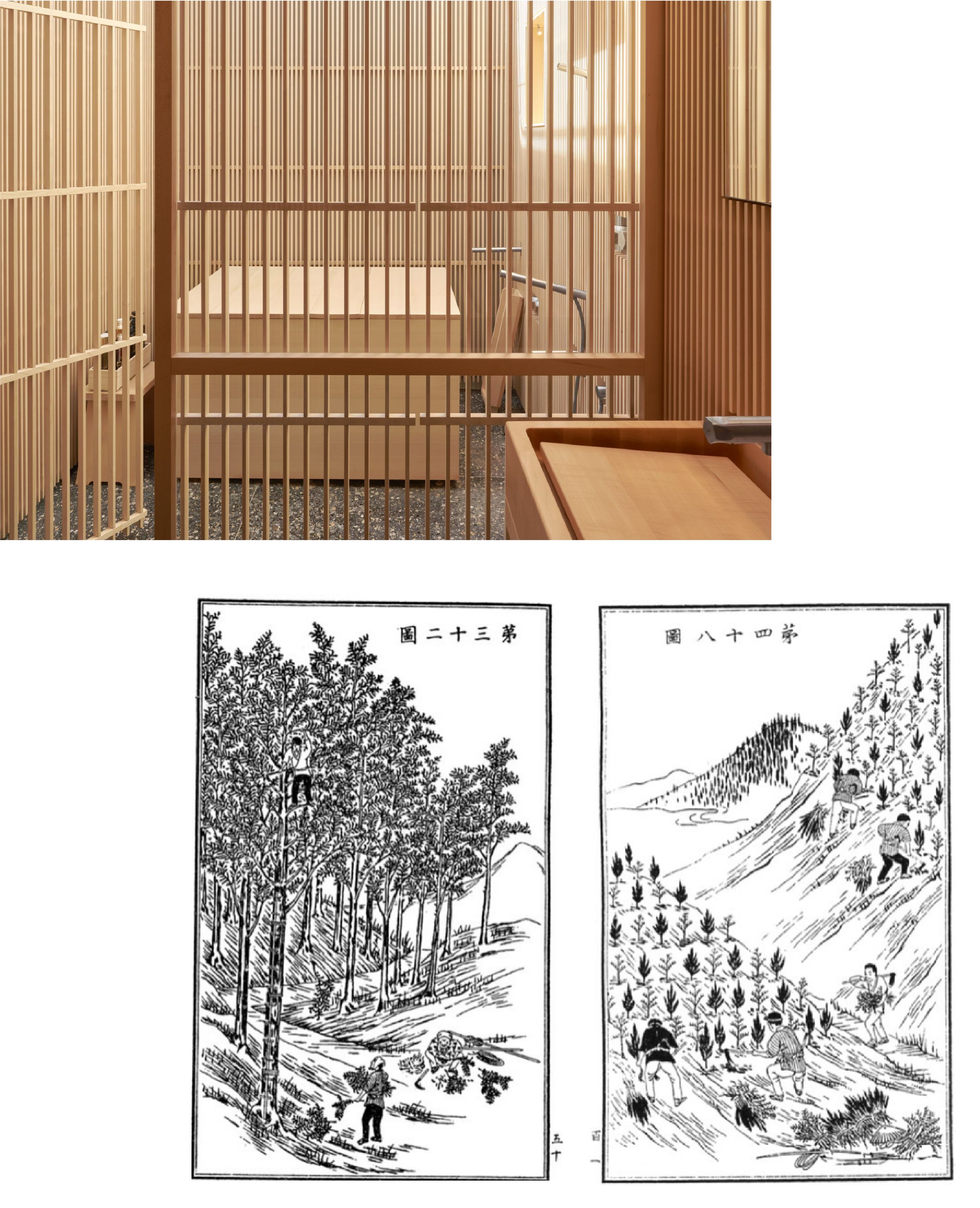 "These are monocultural forests, but remain considerate of nature," says Kodai, explaining the centuries-old cultivation technique (pictured in textbook illustrations). The meticulous work involves the careful thinning and pruning of hinoki and sugi trees as they grow to produce timber beams with a seemingly impossibly sleek, straight grain. This method allows sunlight to reach the forest floor, encouraging biodiversity and improving soil quality. It's an old technique from which the modern forestry industry could learn a lot.