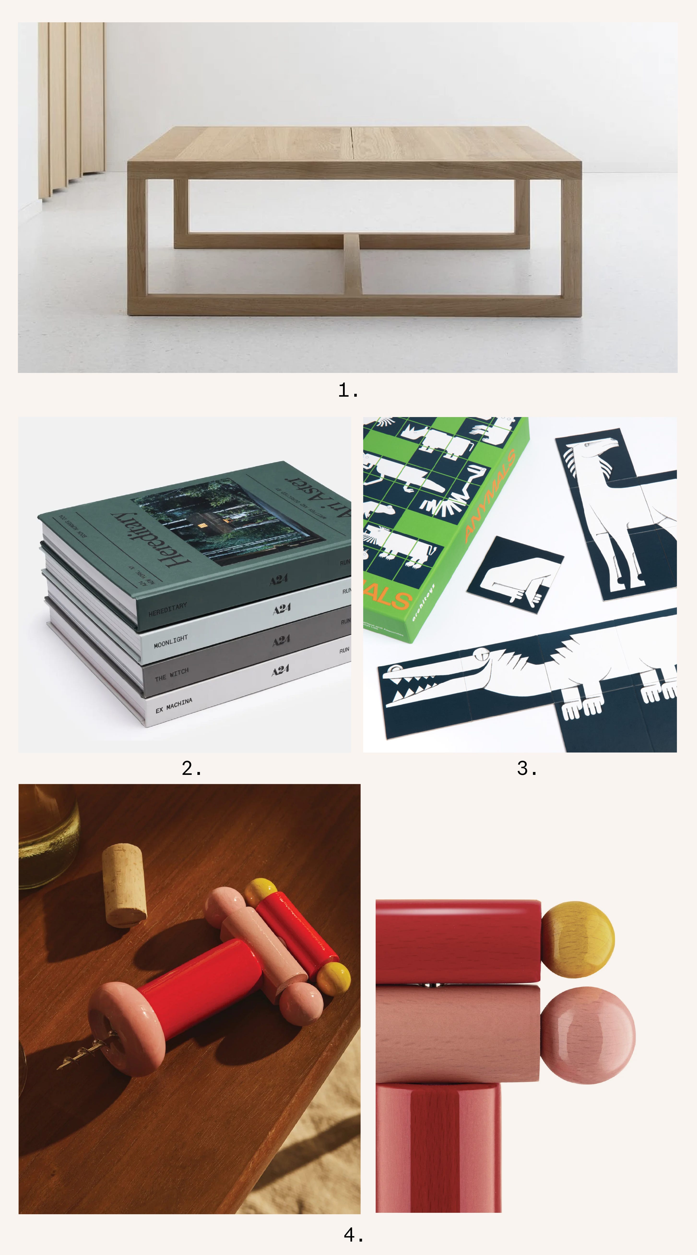 After launching the successful Frame dining table, John Pawson’s new (1) Frame Low table is the most magnificently minimal design we’ve seen in a long time. It is crafted by timber masters Nikari in Finland in oak and ash. It’s a coffee table so fine that we decided to devote the rest of the round-up to nice things to complement it (rather than compete with it) in the home. First up is this beautiful new (2) A24 Screenplay Books Series, published by MACK and available in the US (Europe in September); it uses tasteful colour tones and sharp typographic design to differentiate photo-led storytelling of some of our favourite indie films. The (3) ‘Anymals’ card game provides something a bit more fun in print-form for kids and design-loving grown-ups to play atop a nice timber coffee table. First created by legendary graphic designer Ken Garland, Portugal’s Architoys has re-issued the create-your-own-creature concept, aided by Studio Andrew Howard. Our final playful piece is just for the adults, but the (4) ES17 - Corkscrew by Ettore Sottsass from 1989 is a universally beloved work of design, which is part of the recently updated Twergi collection, available now.