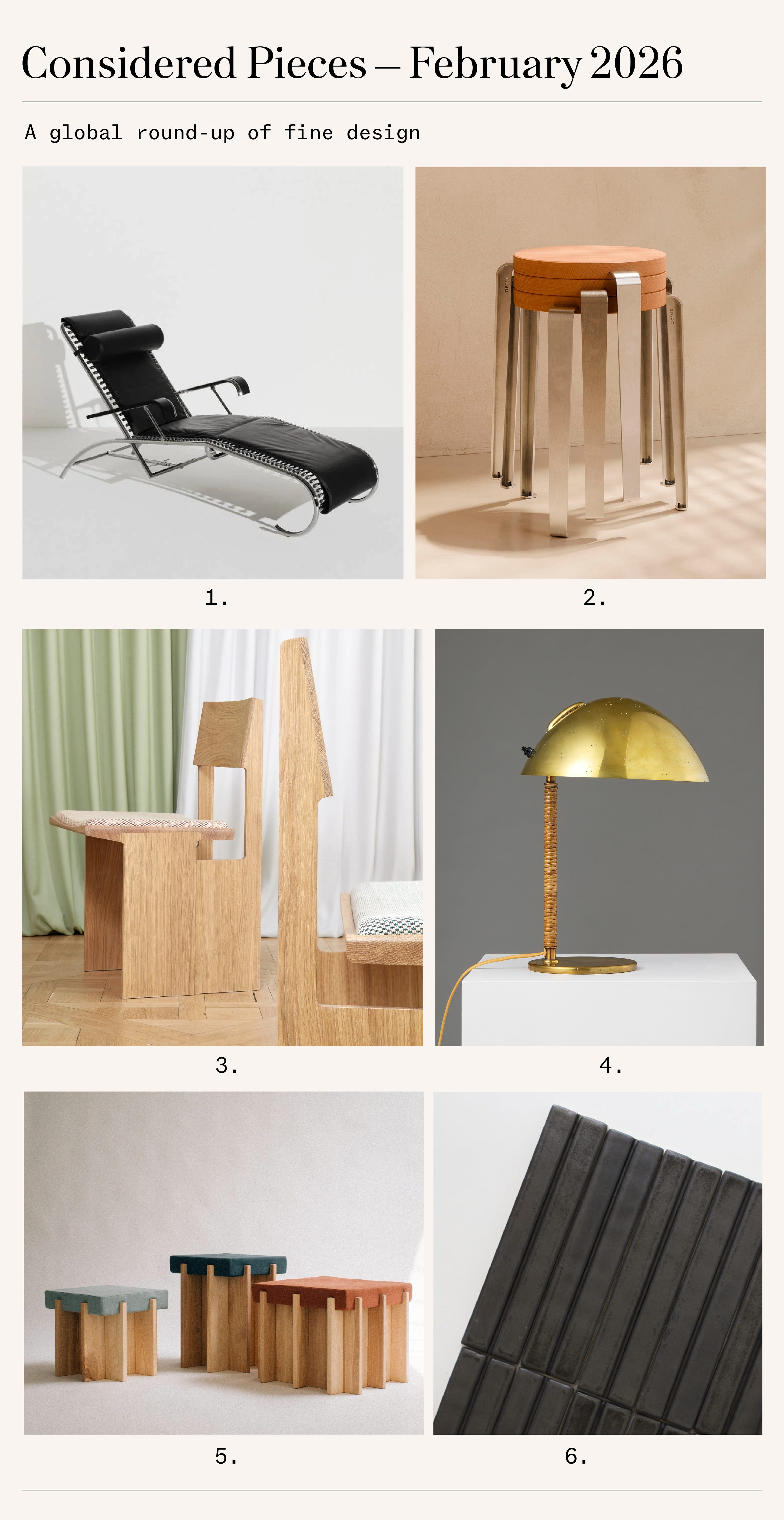 A trio of French releases anchors this week’s edit, beginning with the (1) Sandows Daybed N°114 by René Herbst for Petite Friture (beautiful explainer video here). Unveiled in Paris this January, the re-edition pays homage to the pioneering modernist’s 1927 original - tubular steel and elastic strapping (sandows) that defined French industrial design’s interwar moment. The (2) LOU Stool from Tiptoe distils Gallic pragmatism into a stackable seat that assembles in under a minute. The new CORE edition adds a brushed stainless steel finish to the brand’s signature clamp-on legs, elegantly harmonising industrial utility with chic, covetable design. Rounding out the French contingent is the (3) Drift Chair from Theoreme Editions, designed by Studio BrichetZiegler and pictured in the oak edition. A beautiful creation, its cantilevered seat appears to float above its minimalist frame - a feat of engineering paired with artisan French finishing. It’s available in various timbers with interchangeable fabric or leather cushions.